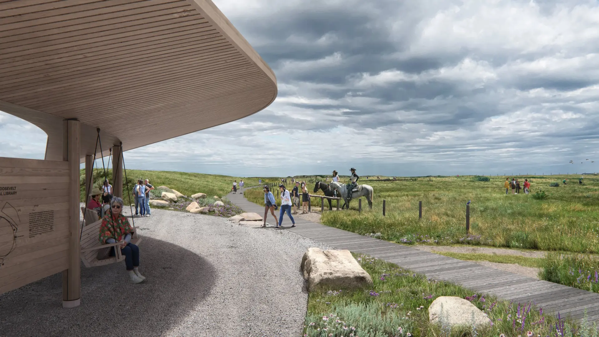 Set in the Badlands landscape that shaped Theodore Roosevelt, the Library invites you outdoors as much as it draws you inside. Take in sweeping prairie views from the roof terrace, then follow the one-mile boardwalk that loops around the building through restored native grasslands, with overlooks and places to pause along the way.